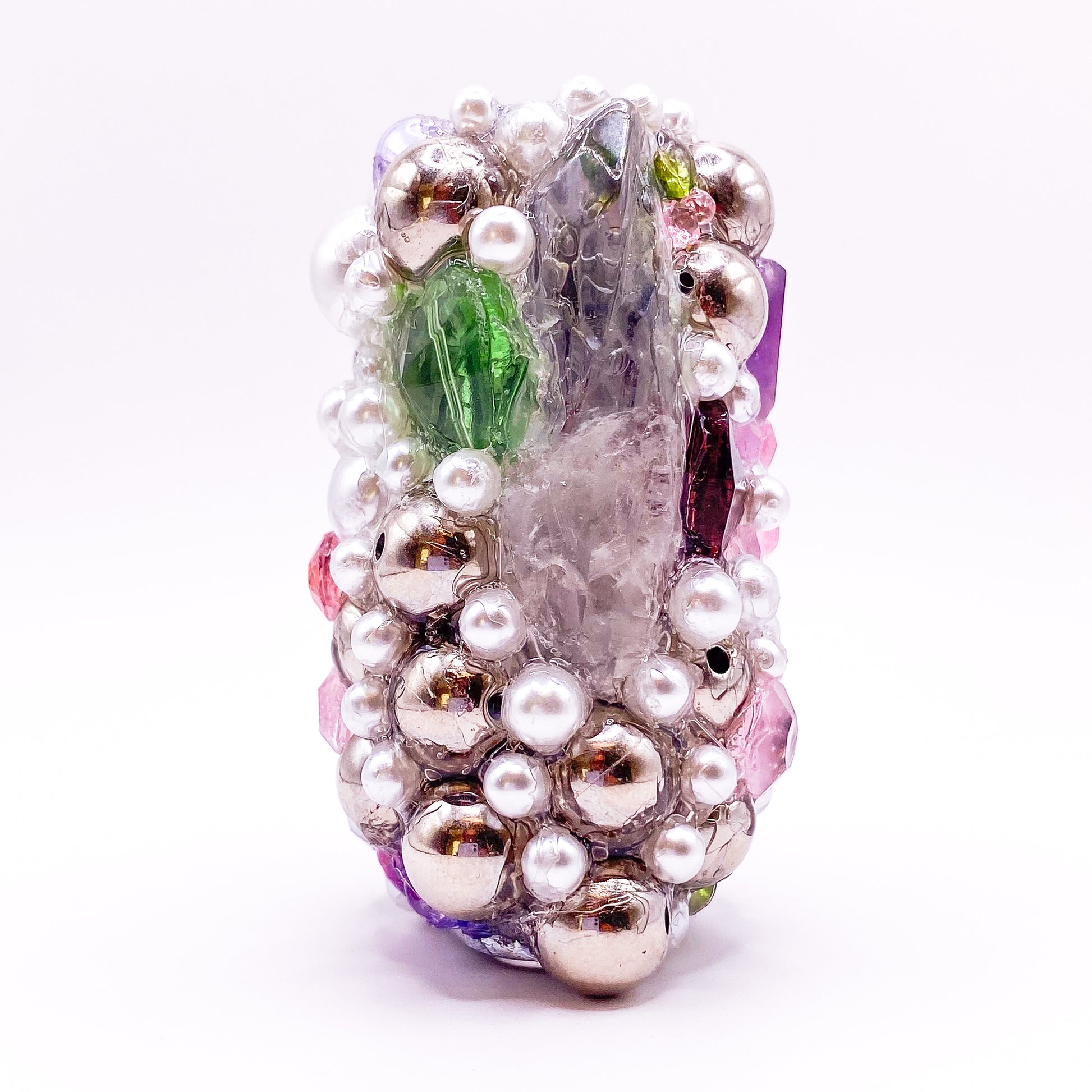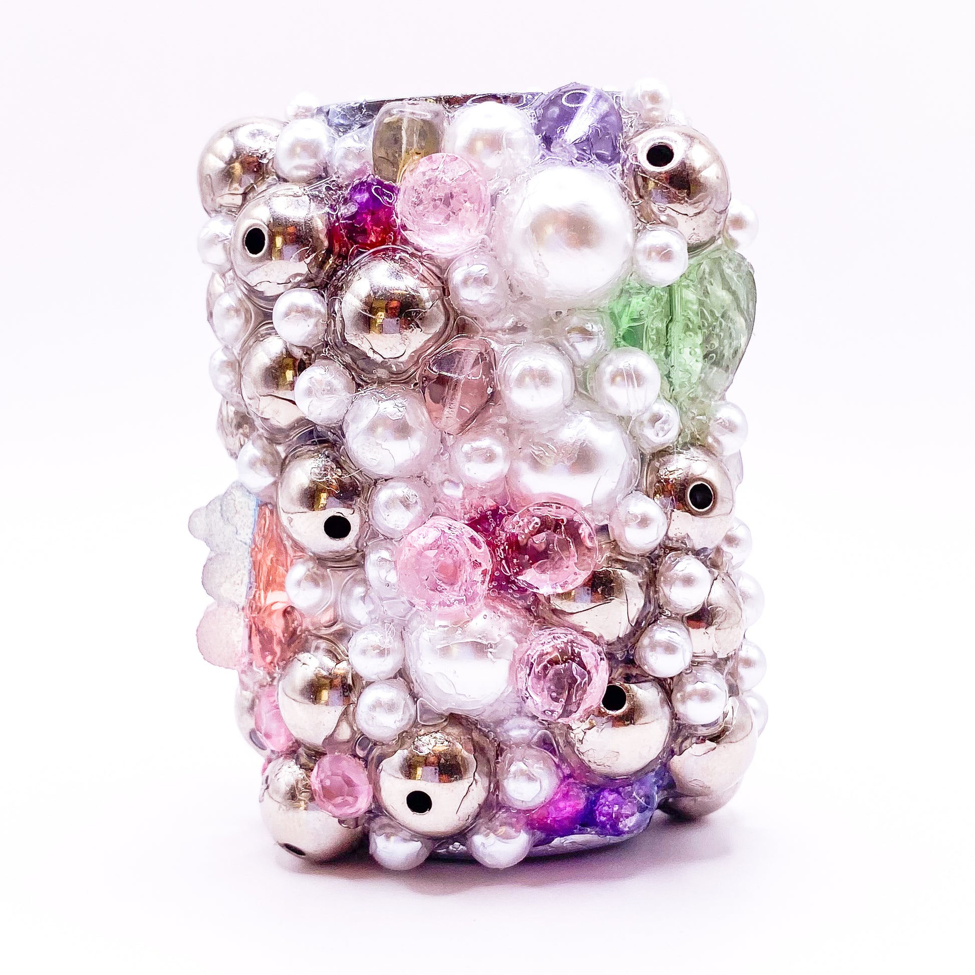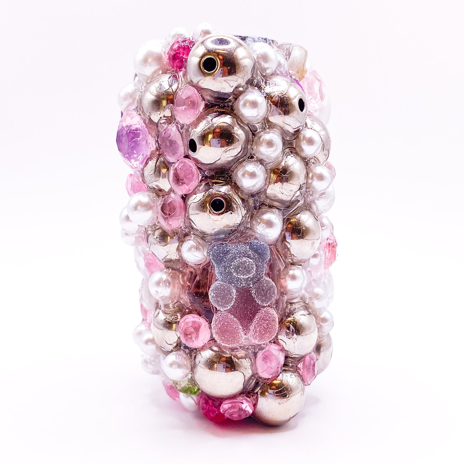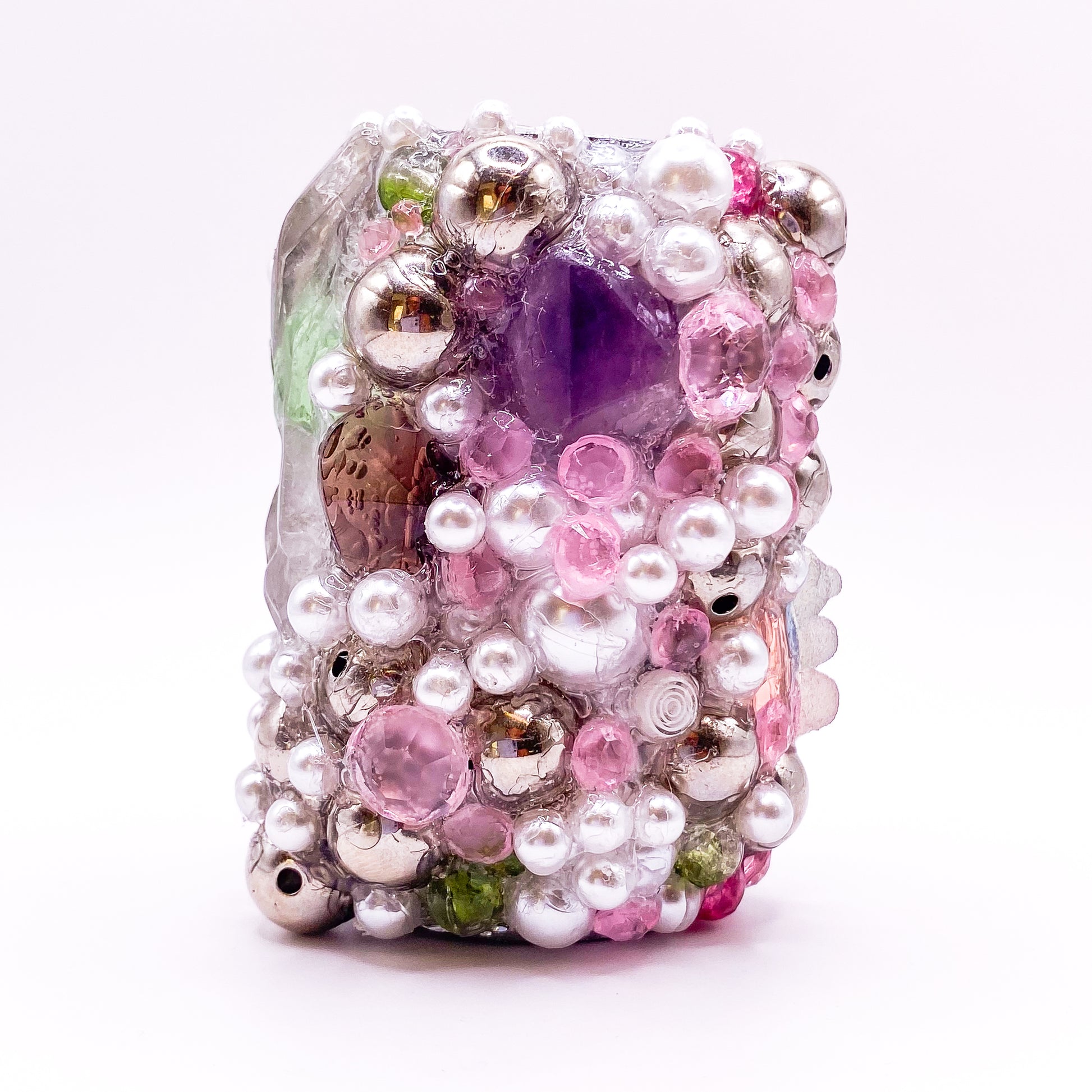 One-of-a-kind handmade lighter sleeve. Gems and beads hand-set on a metal base with industrial-strength adhesive.